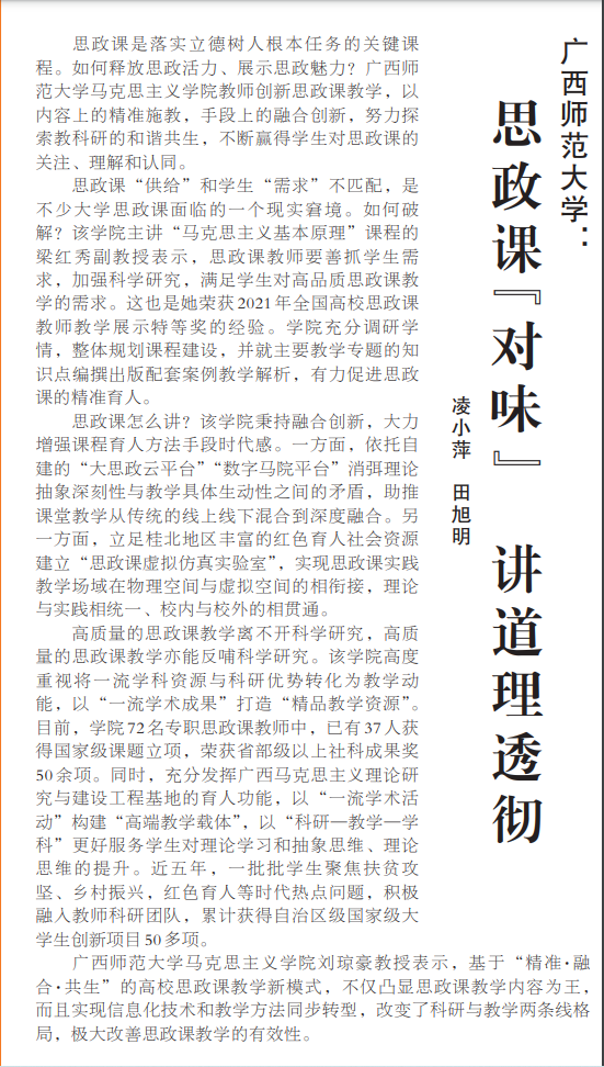 2月15日,《广西日报》第9版以《广西师范大学:思政课“对味”讲道理透彻》为题,刊登广西师范大学马克思主义学院高质量办好思政课的创新做法。文章指出,思政课是落实立德树人根本任务的关键课程,广西师范大学马克思主义学院教师创新思政课教学,以内容上的精准施教,手段上的融合创新,努力探索教学科研的和谐共生,不断提升培根铸魂能力水平,让思政课“对味”、讲道理透彻,努力培养堪当民族复兴重任的时代新人。