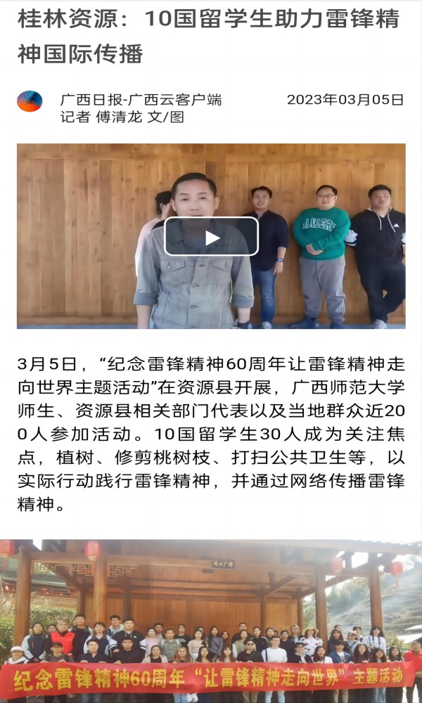 在第60个“学雷锋纪念日”到来之际,3月5日,广西师范大学国际合作与交流处/国际文化教育学院在资源县开展了“纪念雷锋精神60周年让雷锋精神走向世界”主题活动,引导全校留学生践行和弘扬雷锋精神。广西日报-广西云客户端以《桂林资源:10国留学生助力雷锋精神国际传播》为题,关注报道了此次活动。