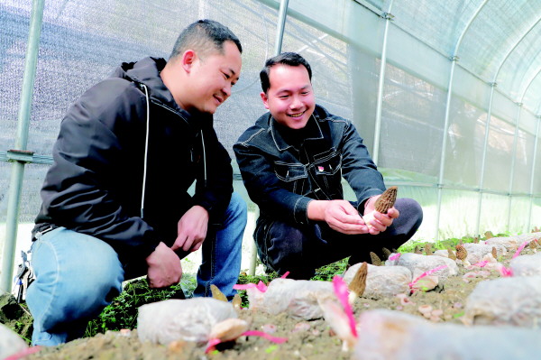 黄宝村驻村第一书记汤明旭(右)和种植户一起察看羊肚菌生长情况。 记者刘健 摄