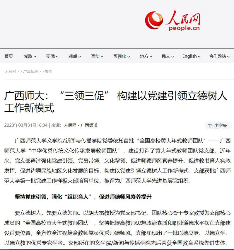 2023年3月31日,人民网以《广西师大:“三领三促” 构建以党建引领立德树人工作新模式》为题,关注报道我校建设打造黄大年式教师团队党支部,近年来,党支部通过强化党建引领、党员带领、文化挈领,促进师德师风素养提升、促进教书育人实效发挥、促进边疆民族地区文化发展的目标,构建以党建引领立德树人工作新模式。支部获批广西师范大学第一批党建工作样板支部培育单位,被评为广西师范大学先进基层党组织。