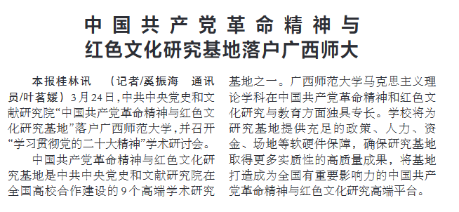 3月25日广西日报—广西云客户端、3月27日《广西日报》004版分别以《【聚焦二十大】中国共产党革命精神和红色文化研究基地落户广西师大|举行“学习贯彻党的二十大精神”学术研讨会》和《中国共产党革命精神和红色文化研究基地落户广西师大》为题,关注报道我校与中共中央党史和文献研究院共建中国共产党革命精神和红色文化研究基地揭牌成立,并以此为契机举办首场高端学术会议。