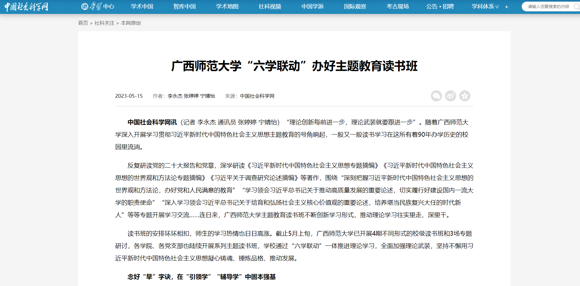 5月15日,中国社会科学网以《广西师范大学“六学联动”办好主题教育读书班》为题,聚焦报道我校高质量办好主题教育读书班的做法与经验。