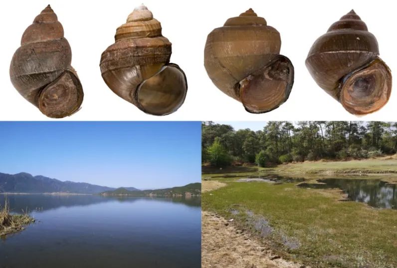 上图为理田螺属4个物种(从左至右:德拉维理田螺、尖龙骨理田螺、滇西理田螺、塔形理田螺),下图为采集地环境——泸沽湖(左)和丽江某湿地(右)