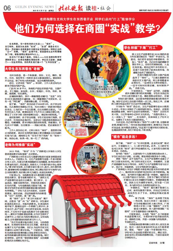 5月17日,桂林晚报以《他们为何选择在商圈“实战”教学?》为题,关注报道我校历史文化与旅游学院大学生校外实践基地“椟市”创新创业项目团队,该项目通过“社团化管理、企业化运营”模式,结合人才培养定位和创新创业教育改革要求,依托学院学科优势和专业特色延展校企合作新路径,打造“新文科实验室”师大样板。