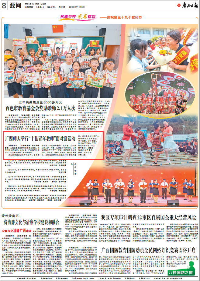 9月10日,《广西日报》数字报第008版以《广西师大举行“十佳青年教师”面对面活动》为题,关注报道我校在庆祝第39个教师节到来之际,举行“十佳青年教师”面对面活动,表彰先进典型,对话身边榜样,汲取精神力量,引领激励广大师生树立“躬耕教坛,强国有我”的志向和抱负。
