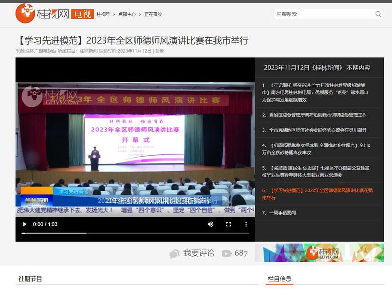 11月12日,【桂林广播电视台】刊播全区师德师风演讲比赛在我校育才校区举行。