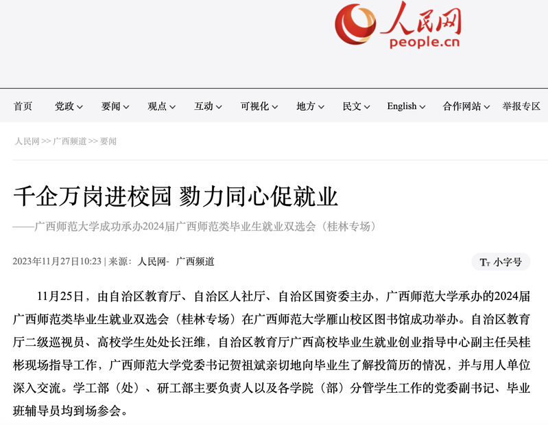 人民网广西频道以《千企万岗进校园 勠力同心促就业——广西师范大学成功举办2024届广西师范类毕业生就业双选会(桂林专场)》为题,关注报道在我校举行2024届广西师范类毕业生就业双选会(桂林专场)。