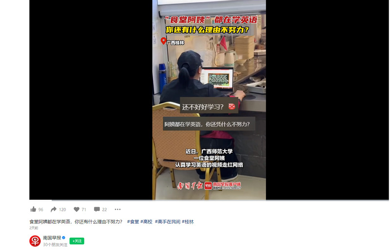 “食堂阿姨都在学英语,你还有什么理由不努力?”近日,广西一所高校的食堂阿姨认真学习英语的视频走红网络,引来不少网友点赞。她是谁?为何如此上进?12月5日,南国早报全媒体记者联系上了这位食堂阿姨。