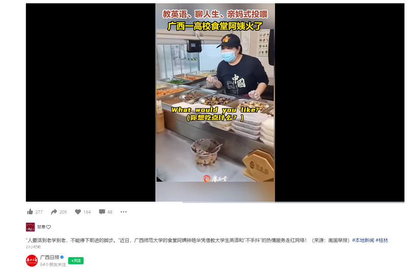 教英语、聊人生、亲妈式投喂……广西一高校食堂阿姨走红网络