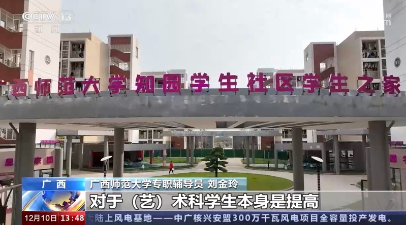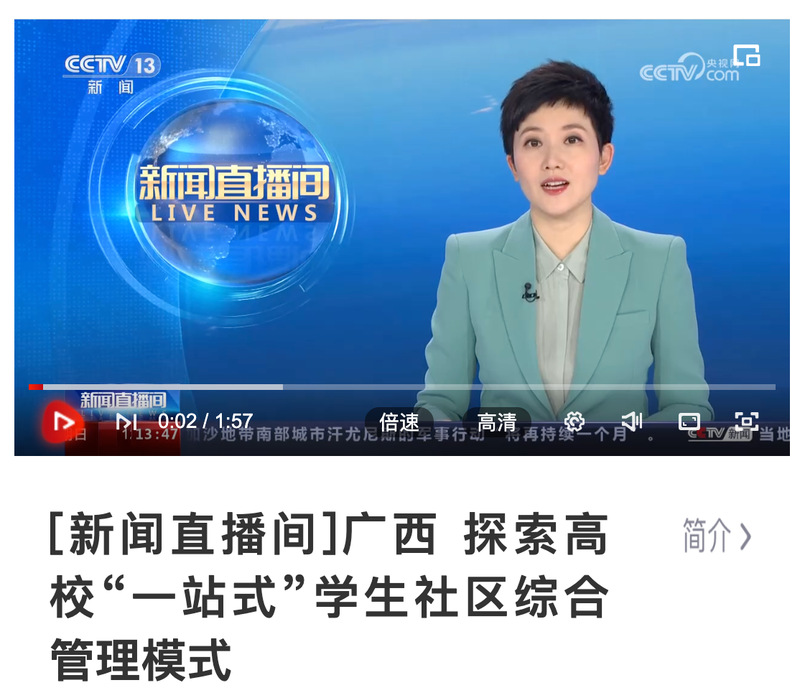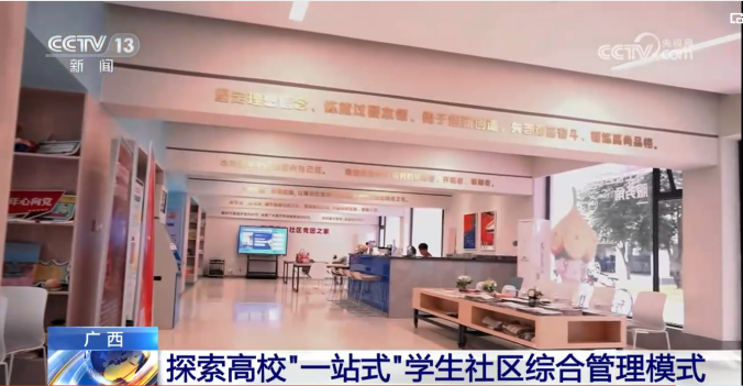 学生社区是高校的基本组成单元,教育部等八部门印发《关于加快构建高校思想政治工作体系的意见》提出:要推动“一站式”学生社区建设,打造思想教育、师生交流、文化活动、生活服务于一体的教育生活园地。在广西,目前已经实现全区高校“一站式”学生社区全覆盖,为学生提供了更加多元的实践、锻炼机会。中央电视台CCTV-13新闻频道《新闻直播间》栏目以《广西 探索高校“一站式”学生社区综合管理模式》为题,报道广西高校“一站式”学生社区建设成果。