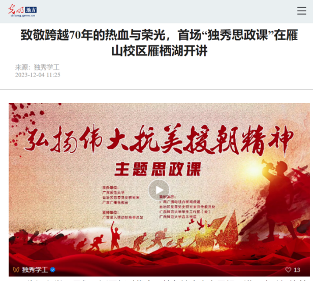 光明网报道:《致敬跨越70年的热血与荣光,首场“独秀思政课”在雁山校区雁栖湖开讲》