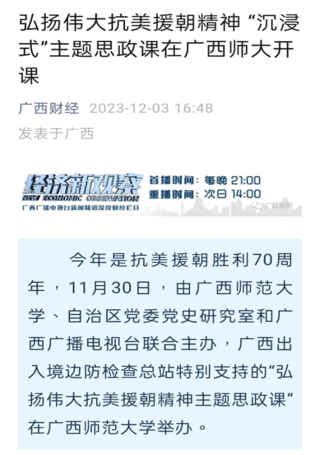 广西广播电视台报道:《弘扬伟大抗美援朝精神“沉浸式”主题思政课在广西师大开课》