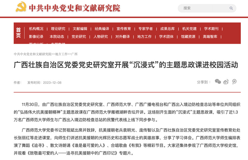 中共中央党史和文献研究院报道:《广西壮族自治区党委党史研究室开展“沉浸式”的主题思政课进校园活动》