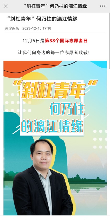 近日南宁广播电视台融媒体中心以《“斜杠青年”何乃柱的漓江情缘》为题通过多种视角报道了政治与公共管理学院何乃柱副教授保护漓江的公益事迹。报道分别从《缘起——少年变身“河流卫生”》《汇聚——众人参与漓江更美》《初心——心怀感恩反哺社会》《传承——公益精神薪火相传》四个方面展开讲述,带领读者全方位立体化地走进何乃柱副教授的公益故事。