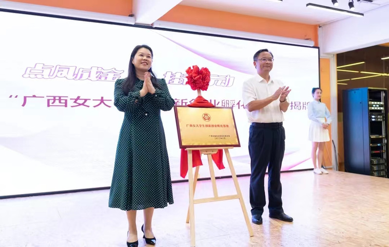 自治区妇联副主席朱红玉与时任学校党委常委、副校长林春逸为“广西女大学生创新创业孵化基地”授牌