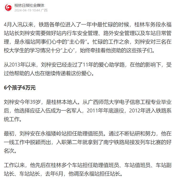 我校校友刘梓安11年爱心助学的故事被【学习强国】《中国青年报》《桂林日报》《桂林晚报》等媒体关注报道,刘梓安校友2004年从我校电子与信息工程学院/集成电路学院电子信息工程专业毕业,毕业后选择应征入伍成为一名军人,2011年年底退役,2012年进入铁路系统工作。在永福矮岭站担任助理值班员。通过不断钻研和努力,他在一线工作中脱颖而出,入职第二年就拿到了南宁铁路局接发列车比赛的好名次。工作以来,他先后在桂林多个车站担任助理值班员、车站值班员、车站副站长、车站站长,2023年6月,他调至永福站担任站长。从2013年以来,刘梓安校友已经走过了11年的爱心助学路,在他的影响下,受过他帮助的人也在继续传递着这份爱心。