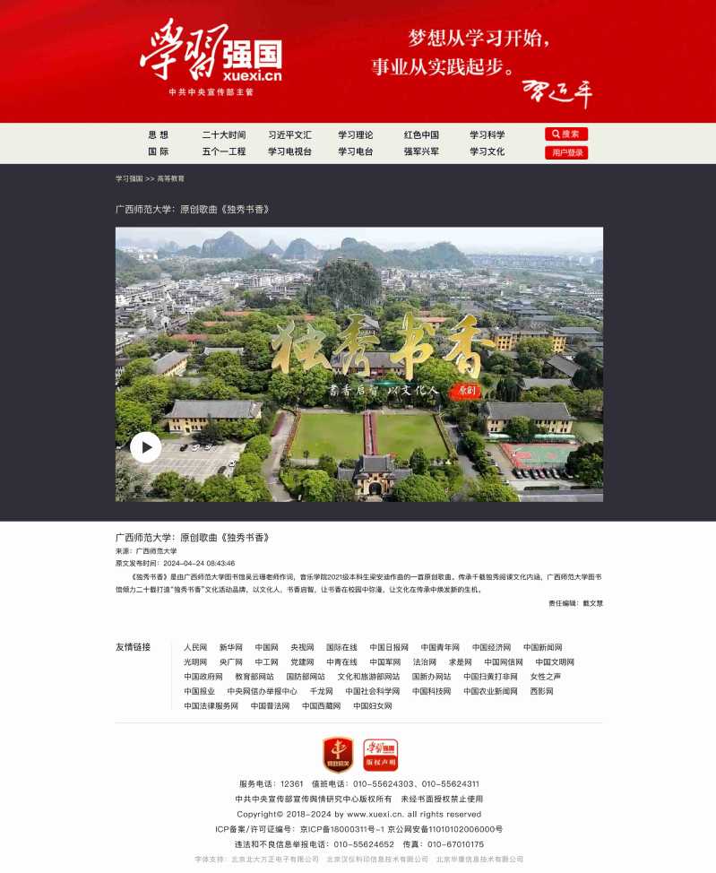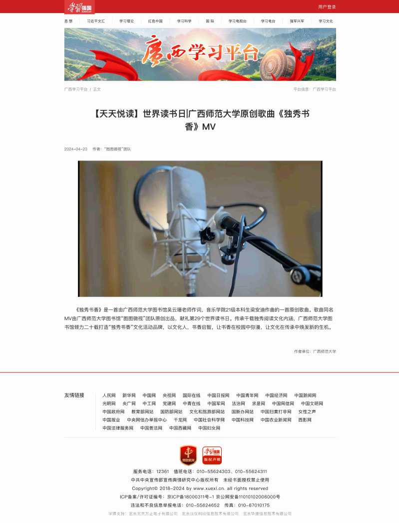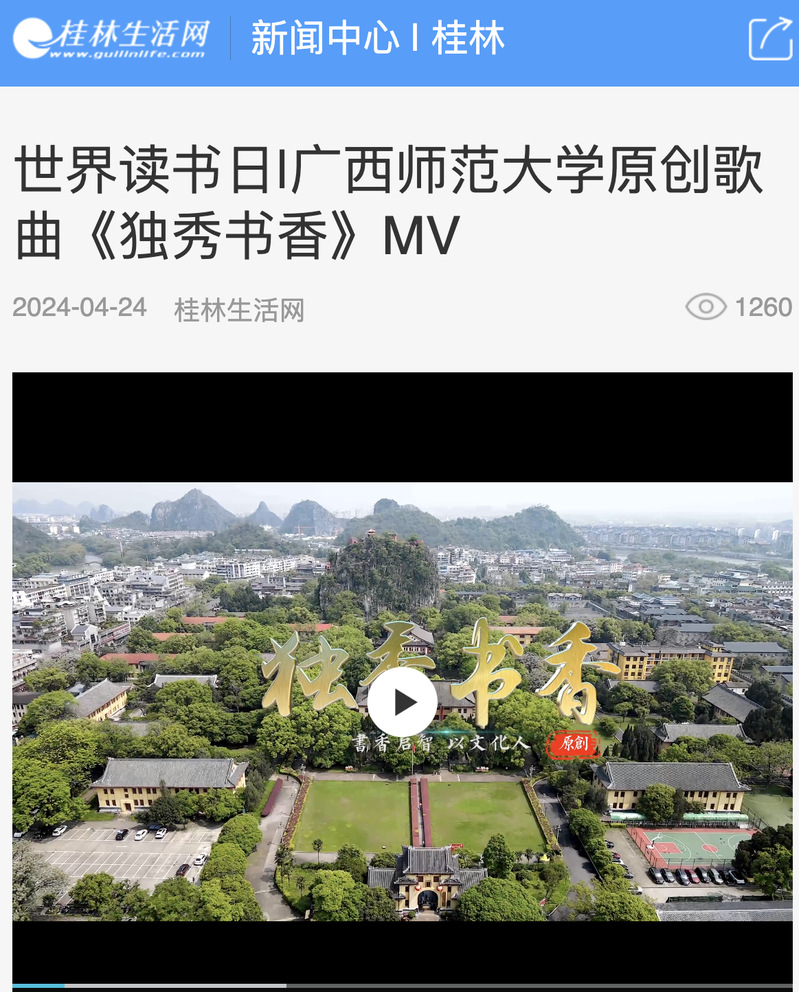 4月23日,广西师范大学图书馆原创歌曲《独秀书香》MV登上“学习强国”广西学习平台,次日被收录进学习强国“百灵-炫”栏目,以及进入“高等教育”频道并得到学习强国首页“教育头条”展示,截稿日点击26813,点赞578。桂林生活网也关注报道了该作品。