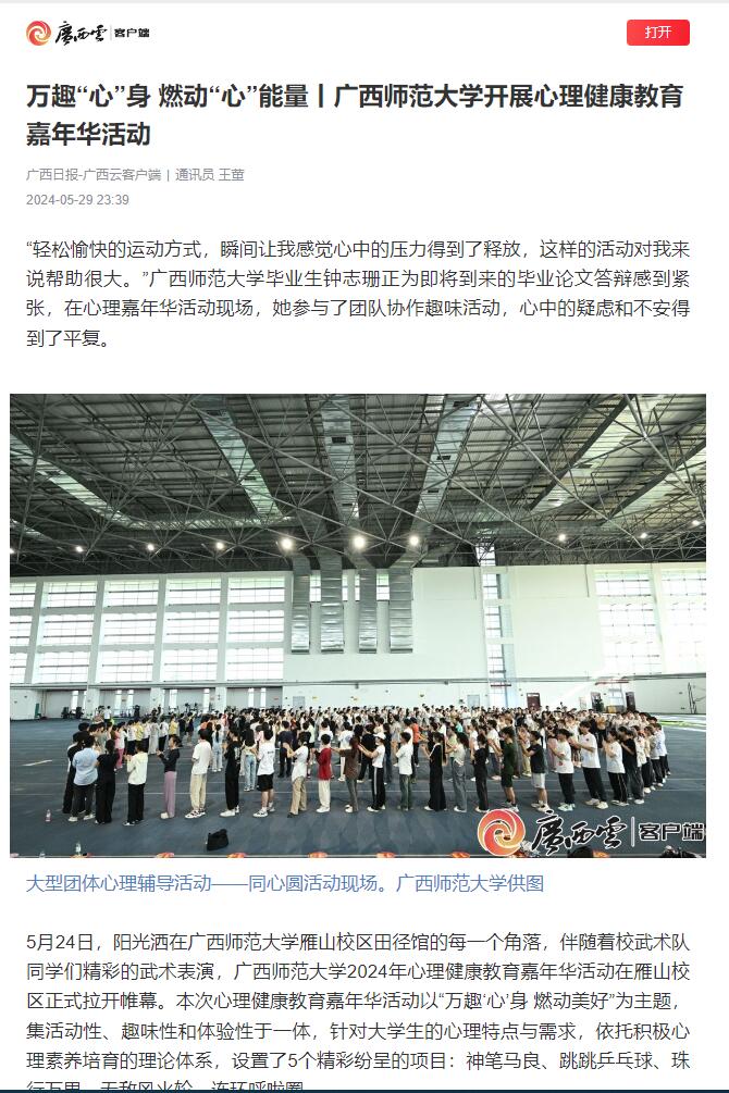 广西日报-广西云客户端以“万趣‘心’身 燃动‘心’能量丨广西师范大学开展心理健康教育嘉年华活动”报道我校心理健康教育嘉年华活动。本次心理健康教育嘉年华活动以“万趣‘心’身 燃动美好”为主题,集活动性、趣味性和体验性于一体,针对大学生的心理特点与需求,依托积极心理素养培育的理论体系,设置了5个精彩纷呈的项目:神笔马良、跳跳乒乓球、珠行万里、无敌风火轮、连环呼啦圈。