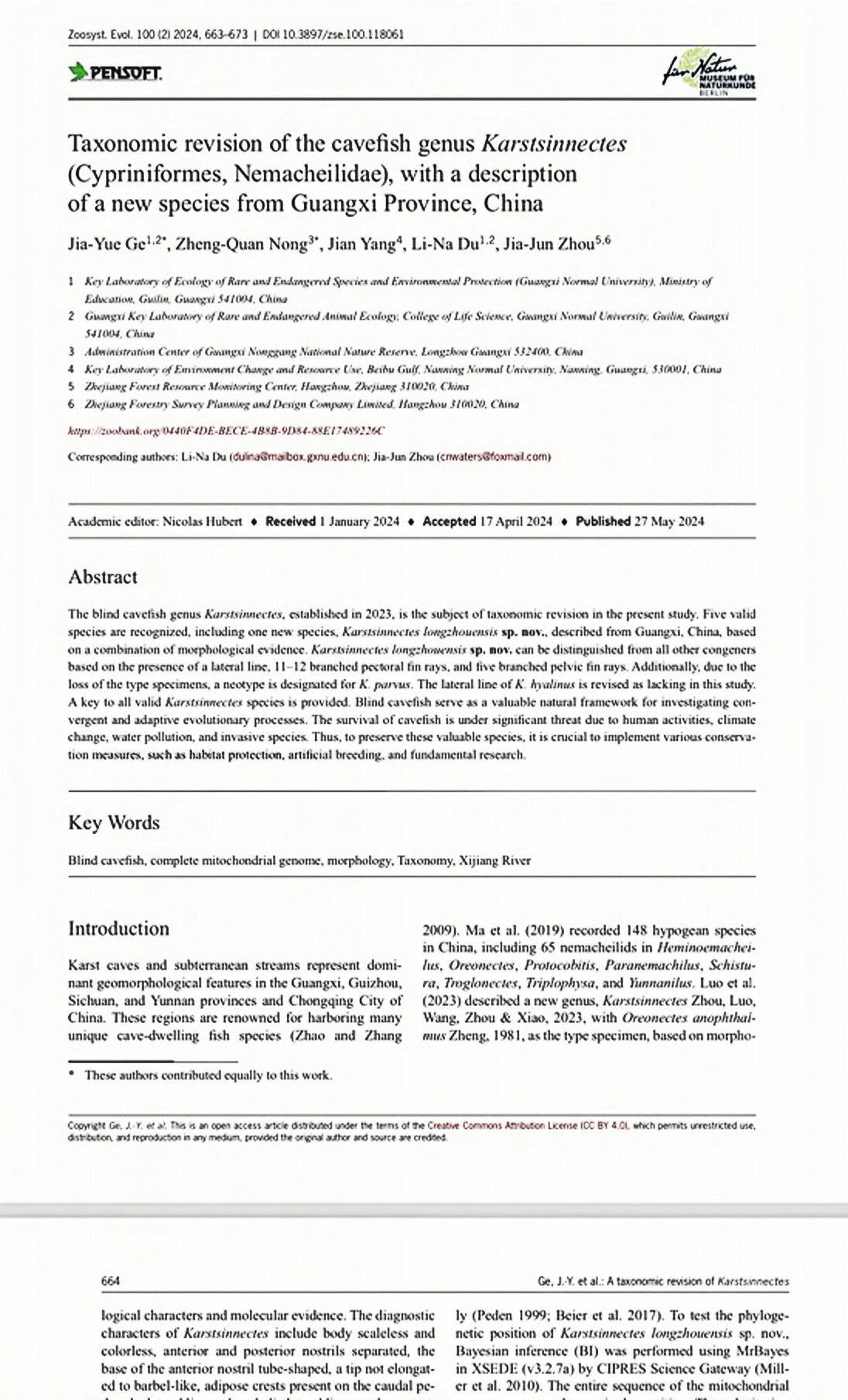 据介绍,中华喀鳅属隶属于鲤形目、条鳅科,是一个2023年建立的新属,为中国特有属,已知分布在珠江流域的广西中西部和北部、贵州南部地区。本属鱼类均为典型洞穴鱼类,它们长期生活在洞穴水环境中,并具有易辨识的特殊适应性形态结构,如眼消失、身体透明等。