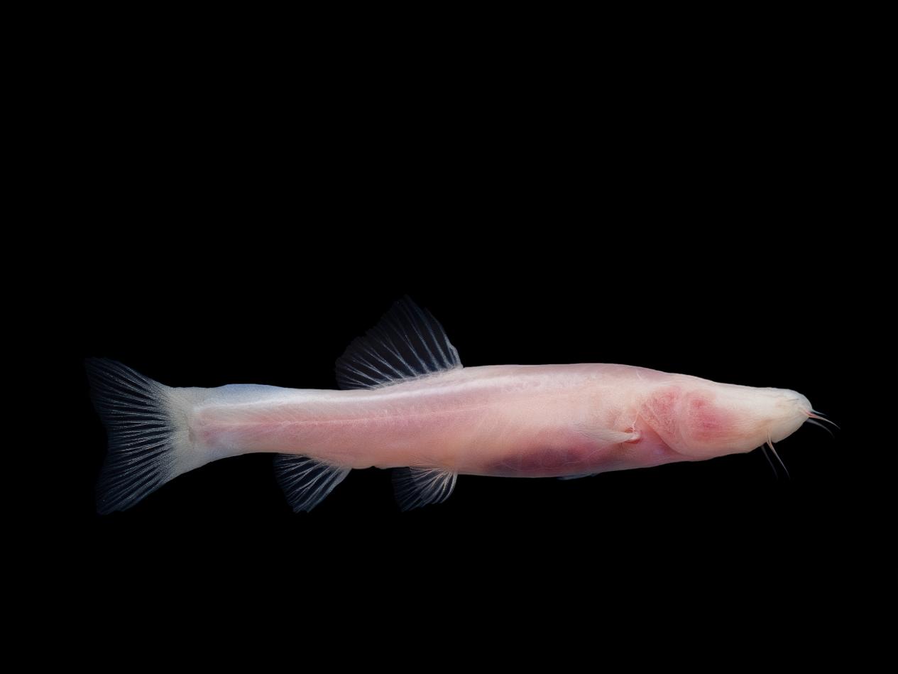 据介绍,“龙州中华喀鳅”是一种栖息于洞穴地下河中的盲鱼,眼睛已彻底消失或仅残存一个细小的眼点,晶状体已缺失。体表色素消失,通体呈半透明,可以看到内脏团;体鳞退化,体表光滑。口须短,胸鳍较长,尾柄上、下均具有发达的尾鳍褶。