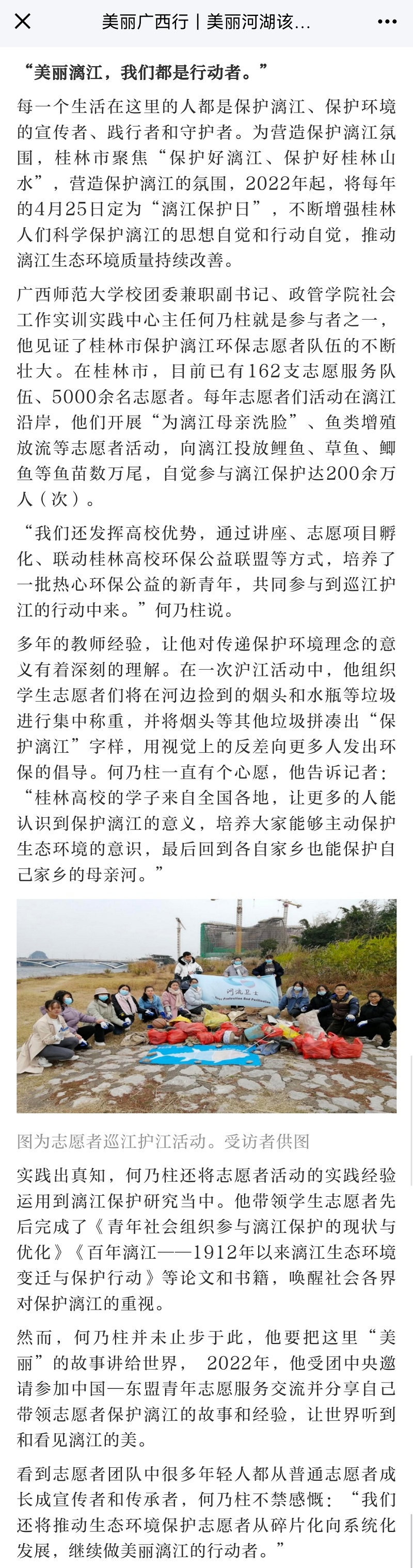 看到志愿者团队中很多年轻人都从普通志愿者成长成宣传者和传承者,何乃柱不禁感慨:“我们还将推动生态环境保护志愿者从碎片化向系统化发展,继续做美丽漓江的行动者。”