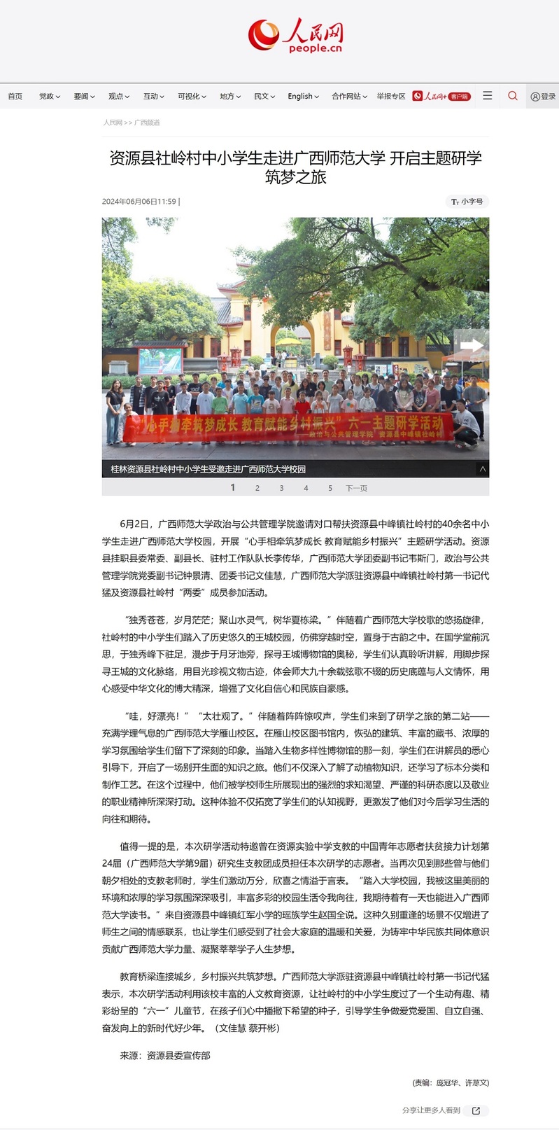 6月6日,人民网发布文章《资源县社岭村中小学生走进广西师范大学开启主题研学筑梦之旅》,关注报道了广西师范大学政治与公共管理学院邀请对口帮扶资源县中峰镇社岭村的40余名中小学生走进广西师范大学校园,开展“心手相牵筑梦成长 教育赋能乡村振兴”主题研学活动。