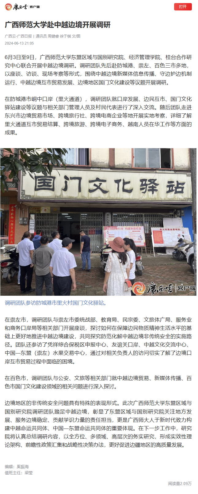6月3日至9日,广西师范大学东盟区域与国别研究院联合经济管理学院和桂台合作研究中心,进行了东盟区域与国别研究院建院以来的首次中越边境调研。调研团队深入防城港、崇左、百色三市,通过座谈、访谈、现场考察等方式,重点探讨了新媒体信息传播、守边护边机制、互市贸易发展及国门文化建设等议题。