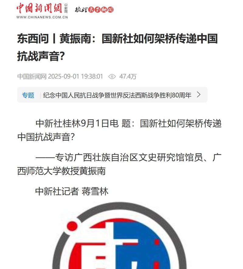 今年是中国人民抗日战争暨世界反法西斯战争胜利80周年,在抗战烽火中诞生的国际新闻社(简称“国新社”)曾以创新性实践架起中西方文明对话的桥梁。9月1日,广西壮族自治区文史研究馆馆员、我校历史文化与旅游学院教授黄振南近日接受中新社“东西问”专访,揭示这段跨文明传播的密码。