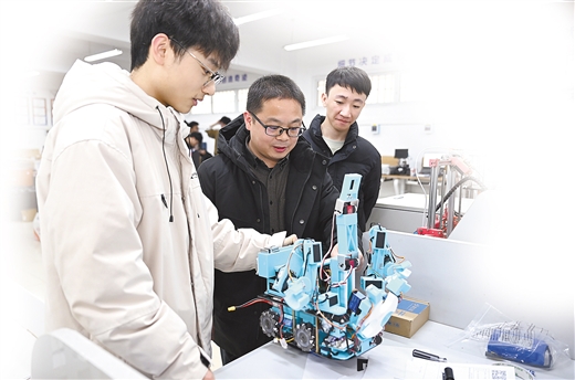 在广西师范大学智能机器人创新基地,指导教师秦运柏指导学生对机器人进行测试。 宁婧怡/摄