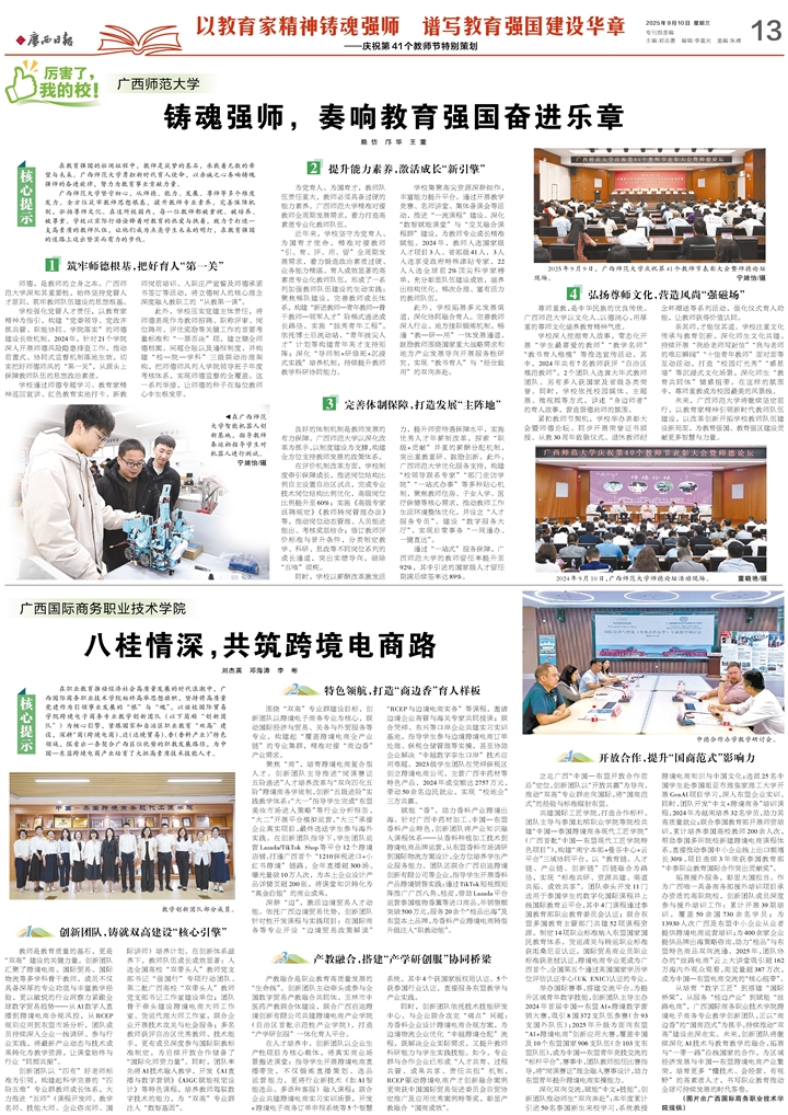 9月10日,第41个教师节当天,《广西日报》第13版“以教育家精神铸魂育人,谱写教育教育强国建设华章”教师节特别策划专栏,以《广西师范大学:铸魂强师,奏响教育强国奋进乐章》为题,关注报道我校教师队伍建设成效。