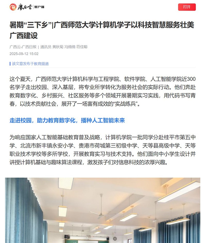 9月12日,【广西云】关注报道我校计算机学子以科技智慧服务壮美广西建设。暑期,我校计算机科学与工程学院、软件学院、人工智能学院近300名学子走出校园、深入基层,将专业所学转化为服务社会的实际行动。他们奔赴教育数字化、乡村振兴、社区服务等多个领域开展暑期实习实践,用代码书写青春,以技术贡献社会,展开了一场富有成效的“实战练兵”。