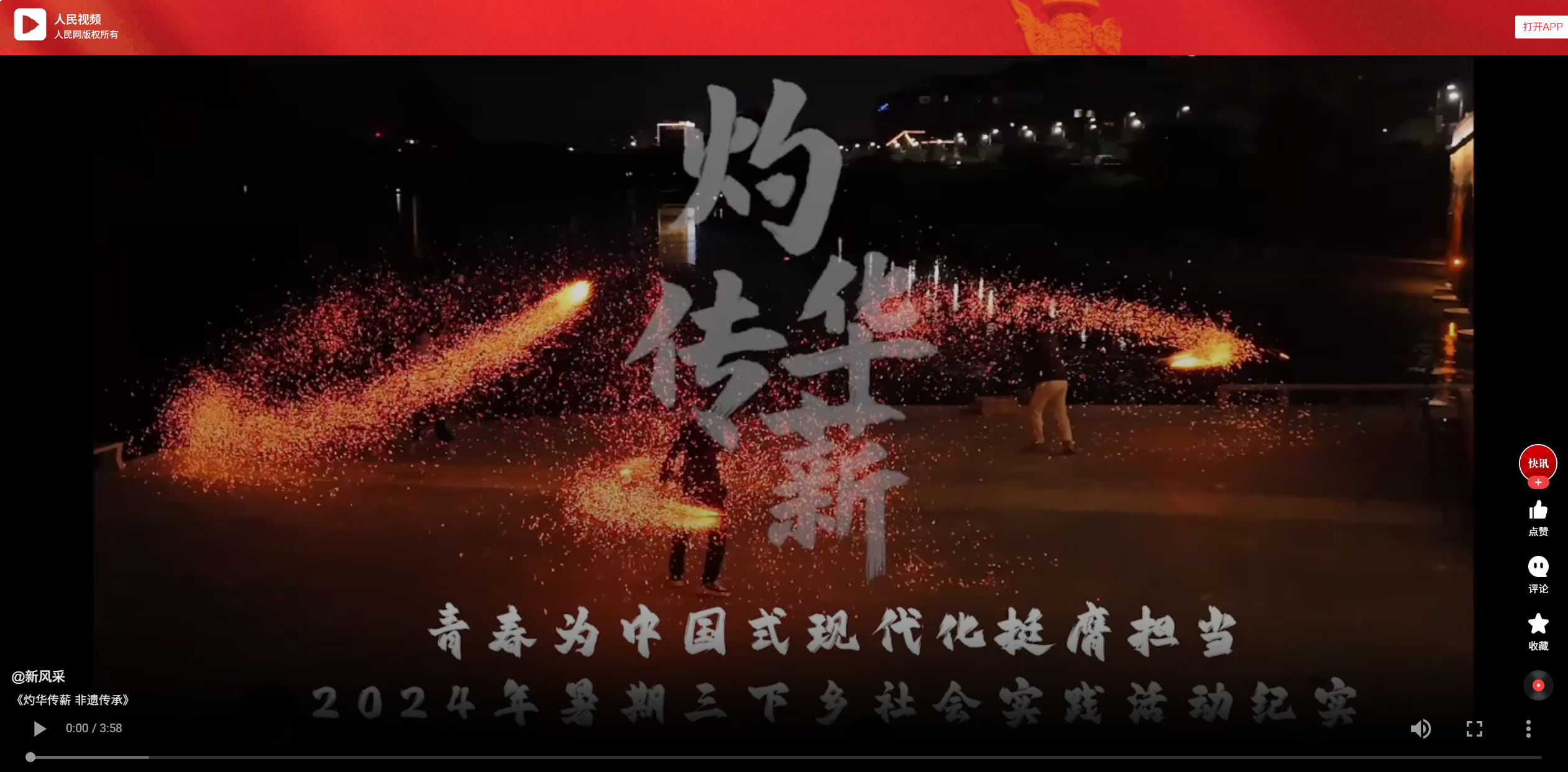 “灼华传薪”实践团队由10名化学与药学学院本科生组成。今年暑期,团队实地采访桂林当地炭花舞传承人唐志鹏先生,了解“炭花舞”传承经历、创新实践与面临的挑战,获取了第一手资料。同时团队成员还深入现场观看和感受“炭花舞”表演,并将所见所闻和所思所想制作成非遗传承视频《灼华传薪 非遗传承》,人民视频对该视频进行了报道,进一步扩大了其传播范围和影响力。这不仅是对“灼华传薪”团队实践成果的认可,也为非遗文化在更广泛平台上传播提供契机。