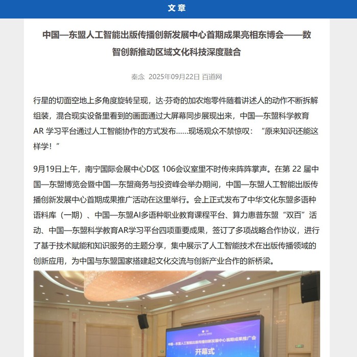 9月19日上午,南宁国际会展中心D区106会议室里不时传来阵阵掌声。在第22 届中国—东盟博览会暨中国—东盟商务与投资峰会举办期间,中国—东盟人工智能出版传播创新发展中心首期成果推广活动在这里举行。会上正式发布了中华文化东盟多语种语料库(一期)、中国—东盟AI多语种职业教育课程平台、算力惠普东盟“双百”活动、中国—东盟科学教育AR学习平台四项重要成果,签订了多项战略合作协议,进行了基于技术赋能和知识服务的主题分享,集中展示了人工智能技术在出版传播领域的创新应用,为中国与东盟国家搭建起文化交流与创新产业合作的新桥梁。