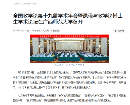 近日,人民网报道由全国教学论专业委员会主办、我校教育学部承办的“全国教学论第十九届学术年会暨课程与教学论博士生学术论坛”在我校成功召开。本次会议以“教学传统现代化与教学伦理重塑”为主题,聚焦数智技术赋能教学转型中的伦理挑战。我校作为承办方,有效组织了此次高水平学术活动,为深化教学论在数智时代的理论创新与实践探索提供了重要平台,展现了其在推动学术共同体发展和教学论学科转型中的积极作用。