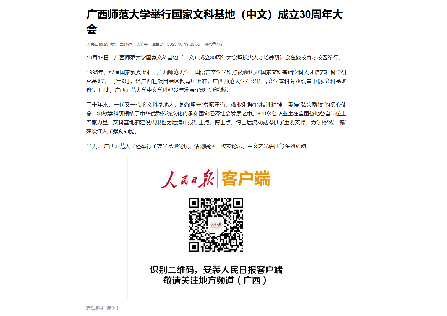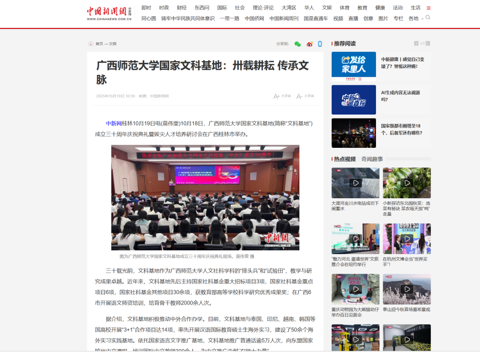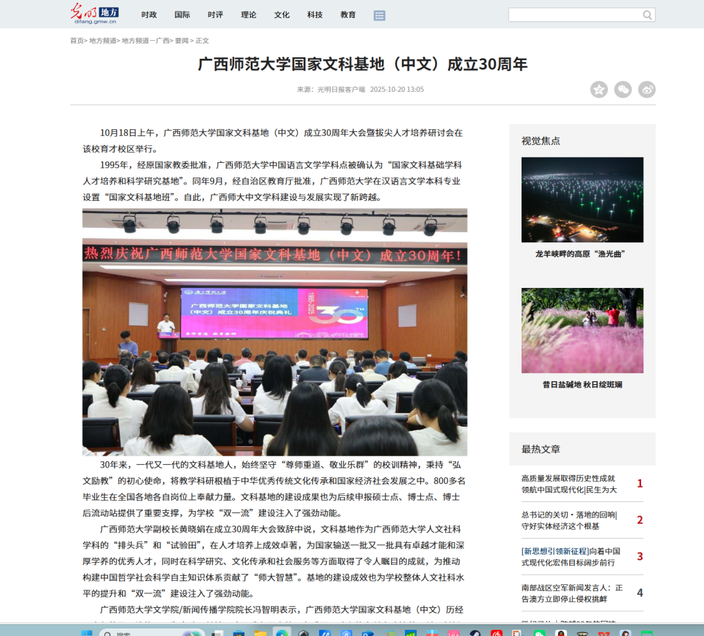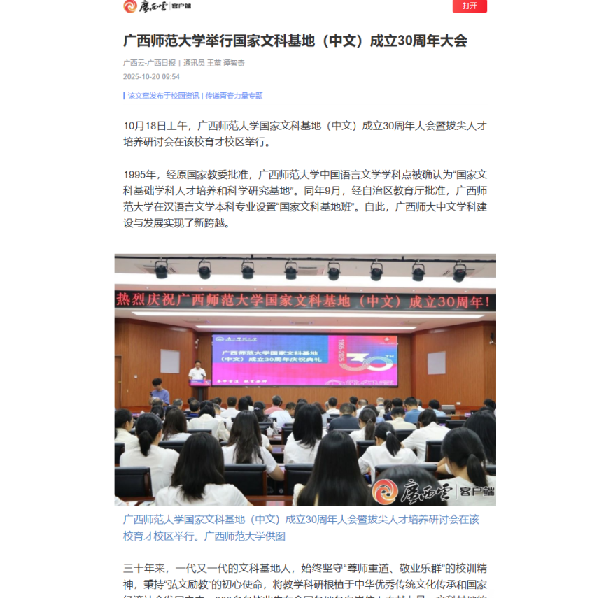 近日,《人民日报》广西频道、《光明日报》客户端、【中国新闻网】【广西云】关注报道我校举行广西师范大学国家文科基地(中文)成立三十周年庆祝典礼暨拔尖人才培养研讨会。该庆祝典礼暨研讨会于10月18日在育才校区举行,获多家媒体关注。据悉,基地于1995年获批,作为广西师范大学人文社科学科的“排头兵”和“试验田”,教学与研究成果卓越。30年来培育800余名毕业生,牵头多项国家社科基金项目并获奖,培训广西2000余人次语文骨干教师,与东盟高校开展14项“3+1”合作项目,建50余个海外实习基地,推广中文并开展教师培训。