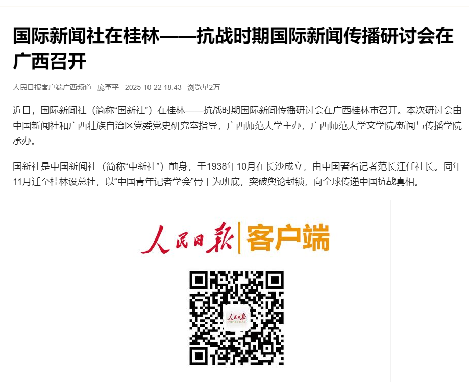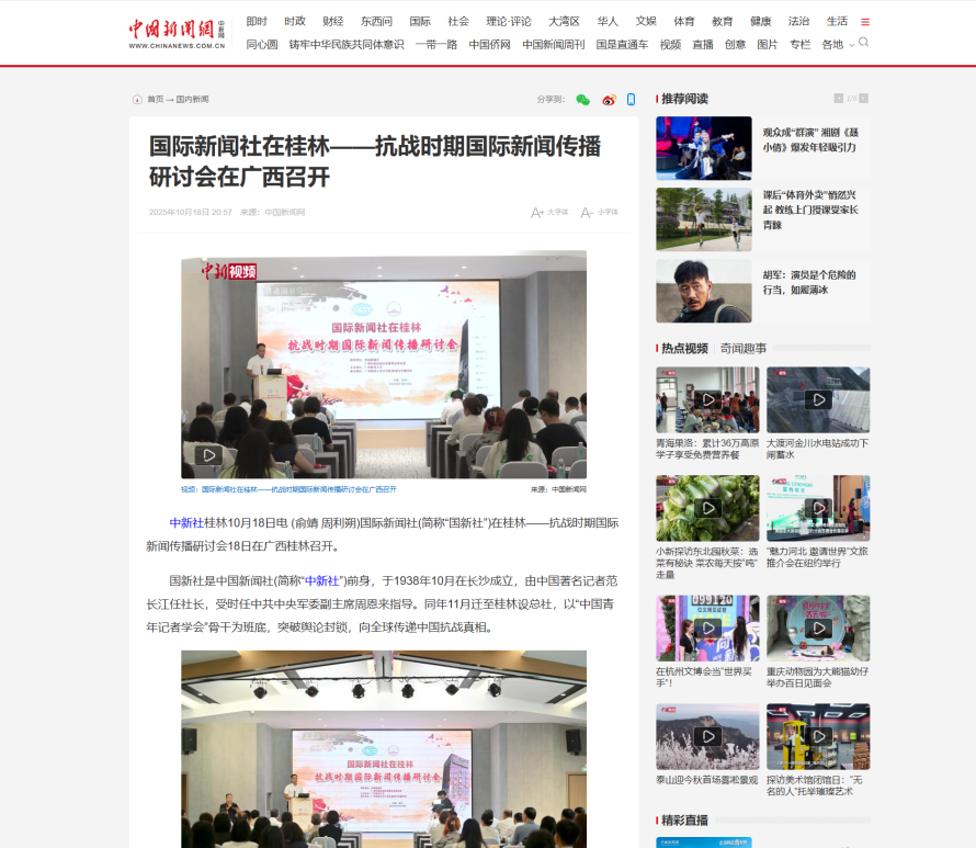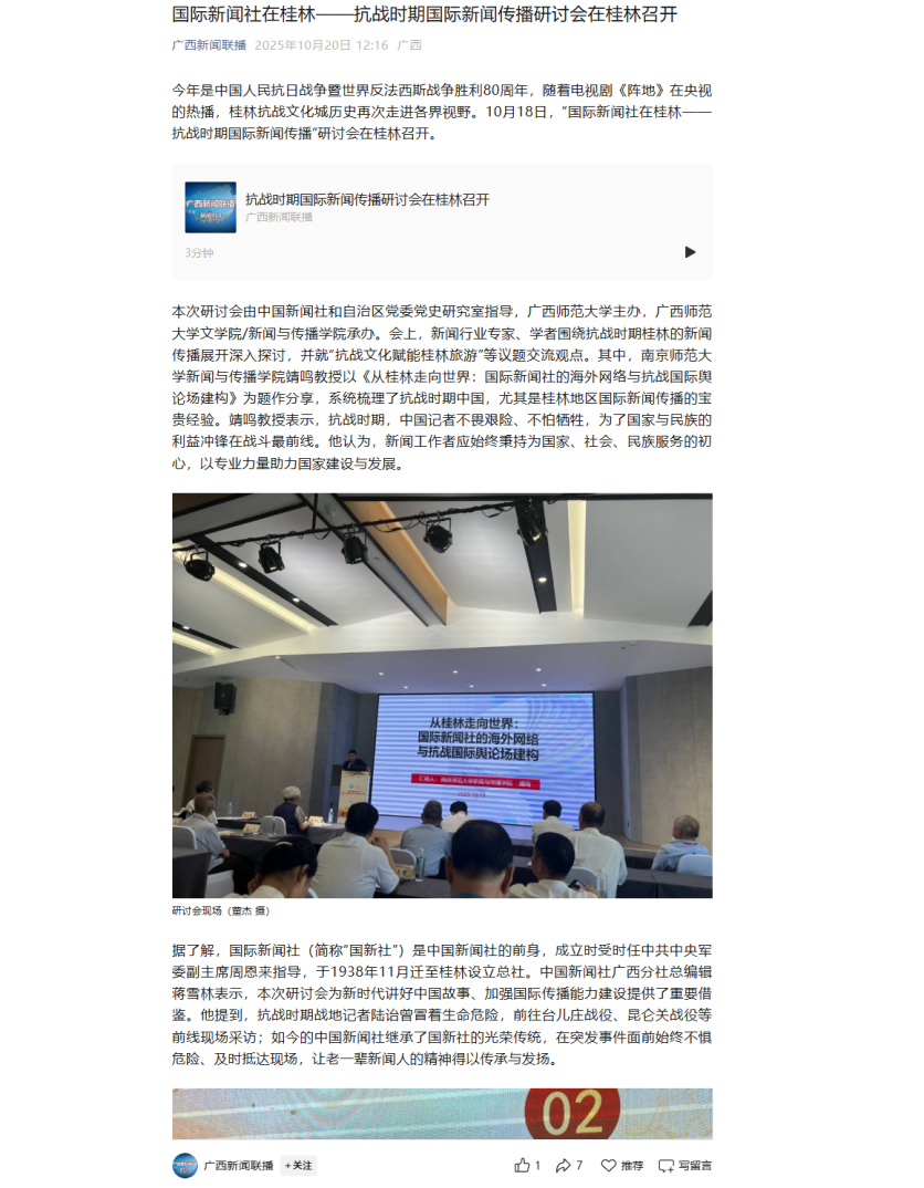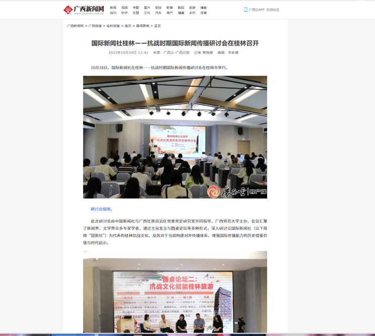 近日,【人民日报】【中国新闻网】【广西广播电视台】【广西新闻网】【桂林广播电视台】报道我校举办国际新闻社在桂林——抗战时期国际新闻传播研讨会。