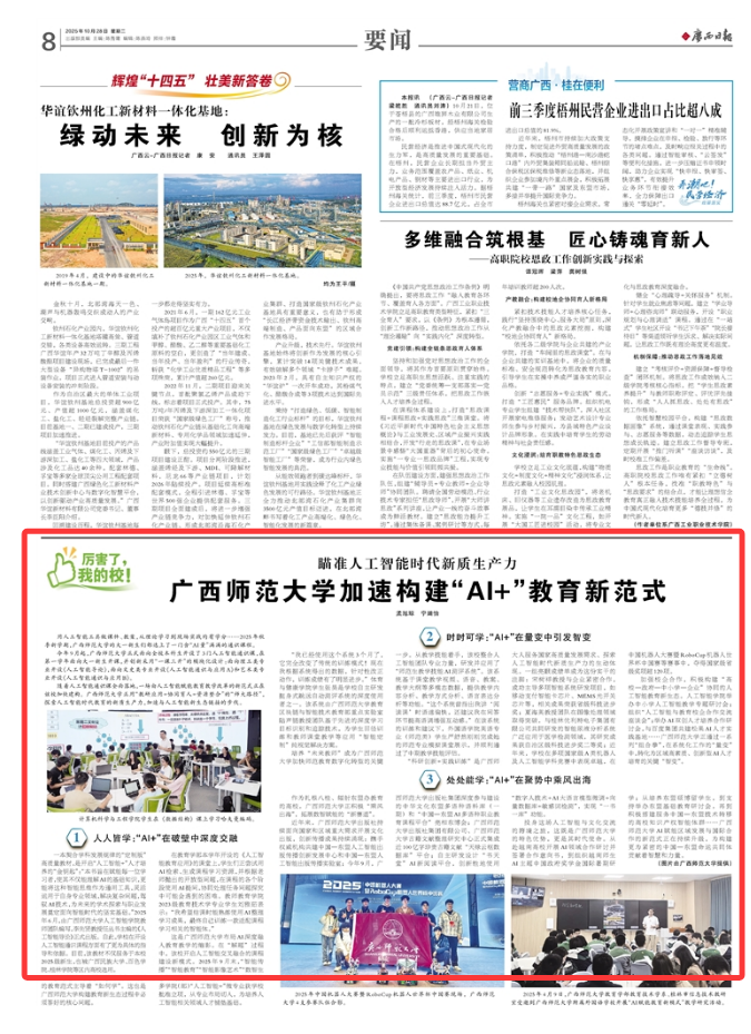 10月28日,《广西日报》第8版以《瞄准人工智能时代新质生产力 广西师范大学加速构建“AI+”教育新范式》为题,关注我校人工智能赋能教育发展的具体举措与实践成效。文章指出,广西师范大学正用“教研应用+协同育人+资源整合”的“师大路径”,探索人工智能时代教育的新质生产力,加速与人工智能新生态链接的步伐。