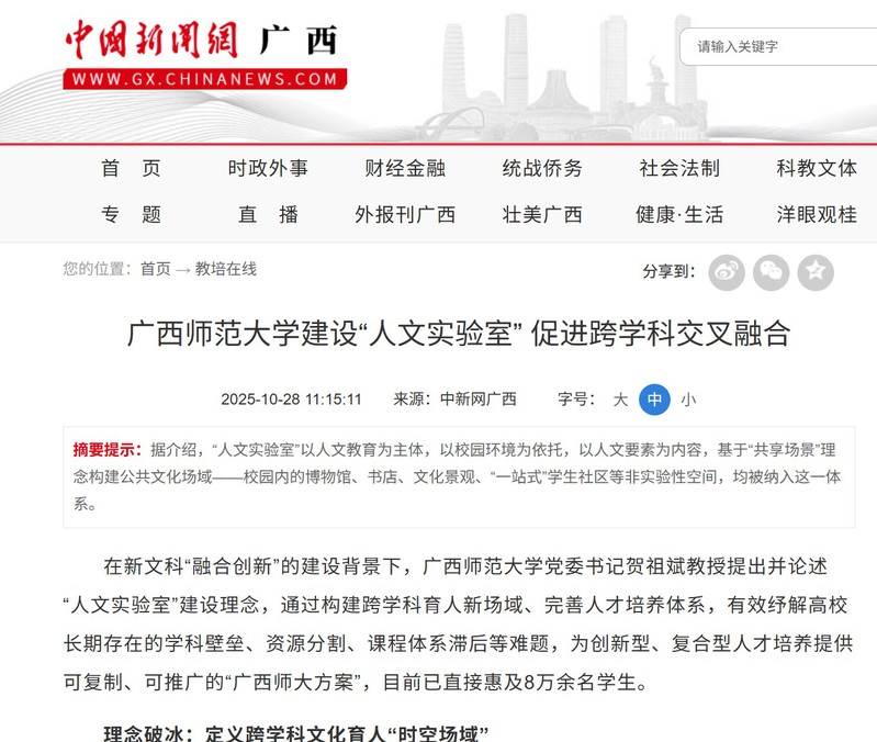 10月28日,【中国新闻网 广西】关注报道我校建设“人文实验室”促进跨学科交叉融合。在新文科“融合创新”的建设背景下,我校党委书记贺祖斌教授提出并论述“人文实验室”建设理念,通过构建跨学科育人新场域、完善人才培养体系,有效纾解高校长期存在的学科壁垒、资源分割、课程体系滞后等难题,为创新型、复合型人才培养提供可复制、可推广的“广西师大方案”,目前已直接惠及8万余名学生。