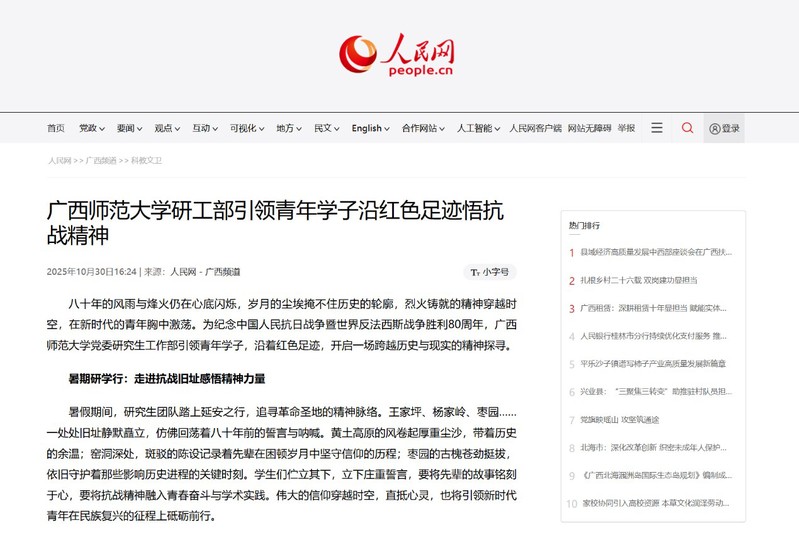 10月30日,【人民网-广西频道】关注报道我校党委研究生工作部引领青年学子,沿着红色足迹,开启一场跨越历史与现实的精神探寻。研工部先后带领学生前往延安、桂林八路军办事处、飞虎队遗址公园,开展实地研学,筑牢历史认知;通过观看阅兵仪式、红色影片等沉浸式体验,推动研究生从“感悟历史”向“内化信念”深化;搭建实践平台,开展望道微课理论宣讲,推动研究生从“被动接受”转向“主动传播”。