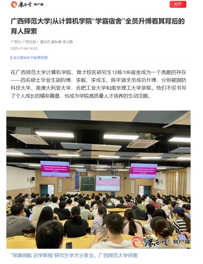近日,《广西日报》【广西云】关注报道我校计算机科学与工程学院育才校区一宿舍四名硕士生全员升博,分别被国防科技大学、南澳大利亚大学等高校录取,成为学院高质量人才培养的生动缩影。他们的成功得益于我校计算机科学与工程学院构建的全链条育人体系:宿舍内时常进行的“学术沙龙”营造了浓厚的研讨氛围;学院打造的“本—硕—博”贯通培养体系为学生搭建了持续深造的立交桥;教育部重点实验室及多个校内外实践基地为学生提供了坚实的科研平台;由国家级领军人才等组成的雄厚师资则给予了他们全方位的悉心指导。这一案例集中体现了我校计算机学院在拔尖创新人才培养上的扎实探索与显著成效。