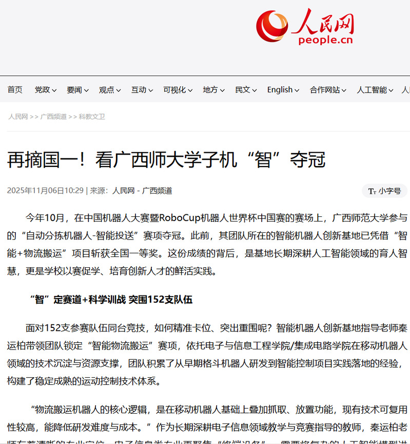 今年10月,在中国机器人大赛暨RoboCup机器人世界杯中国赛的赛场上,广西师范大学参与的“自动分拣机器人-智能投送”赛项夺冠。此前,其团队所在的智能机器人创新基地已凭借“智能+物流搬运”项目斩获全国一等奖。这份成绩的背后,是基地长期深耕人工智能领域的育人智慧,更是学校以赛促学、培育创新人才的鲜活实践。