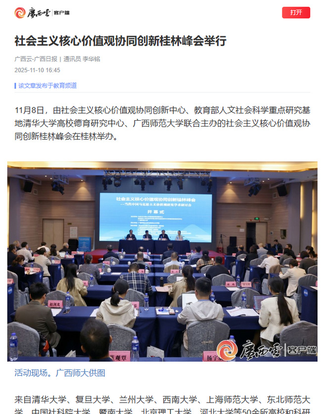 近日,《广西日报》【广西云】关注报道社会主义核心价值观协同创新桂林峰会在桂林举行。本次峰会由我校与社会主义核心价值观协同创新中心、清华大学高校德育研究中心联合主办。来自清华大学、复旦大学等50余所高校的专家学者齐聚桂林,围绕“当代中国马克思主义价值观”的内涵与实践进行深入研讨。与会专家一致认为,该价值观是马克思主义与中国实际及中华优秀传统文化相结合的产物,是以社会主义核心价值观为核心的自主知识体系和价值观整合体。会议强调,培育这一价值观需久久为功。我校作为主办方,为此次高水平学术交流搭建了宝贵平台。峰会共收到投稿200余篇,收录80篇参会论文,通过深入探讨为汇聚建设社会主义现代化强国的价值力量贡献了智慧。
