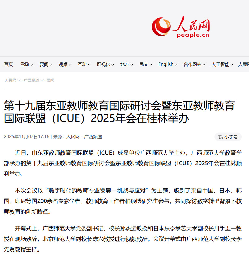 近日,《人民网》关注报道第十九届东亚教师教育国际研讨会暨东亚教师教育国际联盟(ICUE)2025年会在桂林落幕。本次国际盛会由我校主办,我校教育学部具体承办。会议以“数字时代的教师专业发展—挑战与应对”为主题,汇聚了来自中国、日本、韩国、印尼等国的200余名专家学者。我校校长孙杰远教授在开幕式现场致辞,副校长李先贤教授主持开幕式,充分展现了我校在该领域的组织力和影响力。与会代表通过10场主题汇报和3场专题对话,深入探讨了教育数字化转型等前沿议题。在闭幕式上,我校教育学部常务副部长叶蓓蓓教授系统总结了大会成果,并顺利完成会旗交接。本届会议由我校搭建起的高水平国际交流平台,共收到论文180余篇,组织活动40余场,有效推动了东亚地区教师教育的协同创新与可持续发展,彰显了我校在教师教育领域的国际化学术声誉与领导力。