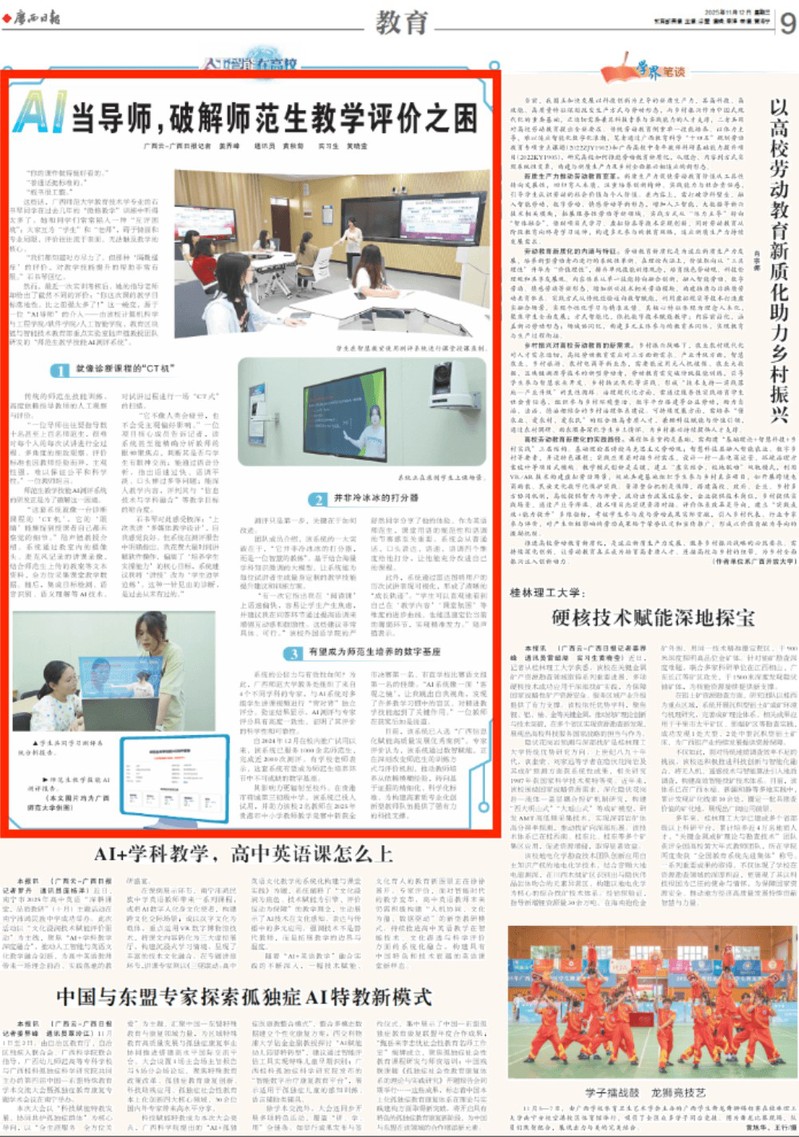 11月12日,《广西日报》第009版以“AI当导师,破解师范生教学评价之困”为题,关注报道由我校计算机科学与工程学院/软件学院/人工智能学院、教育区块链与智能技术教育部重点实验室陆声链教授团队研发的“师范生教学技能AI测评系统”。