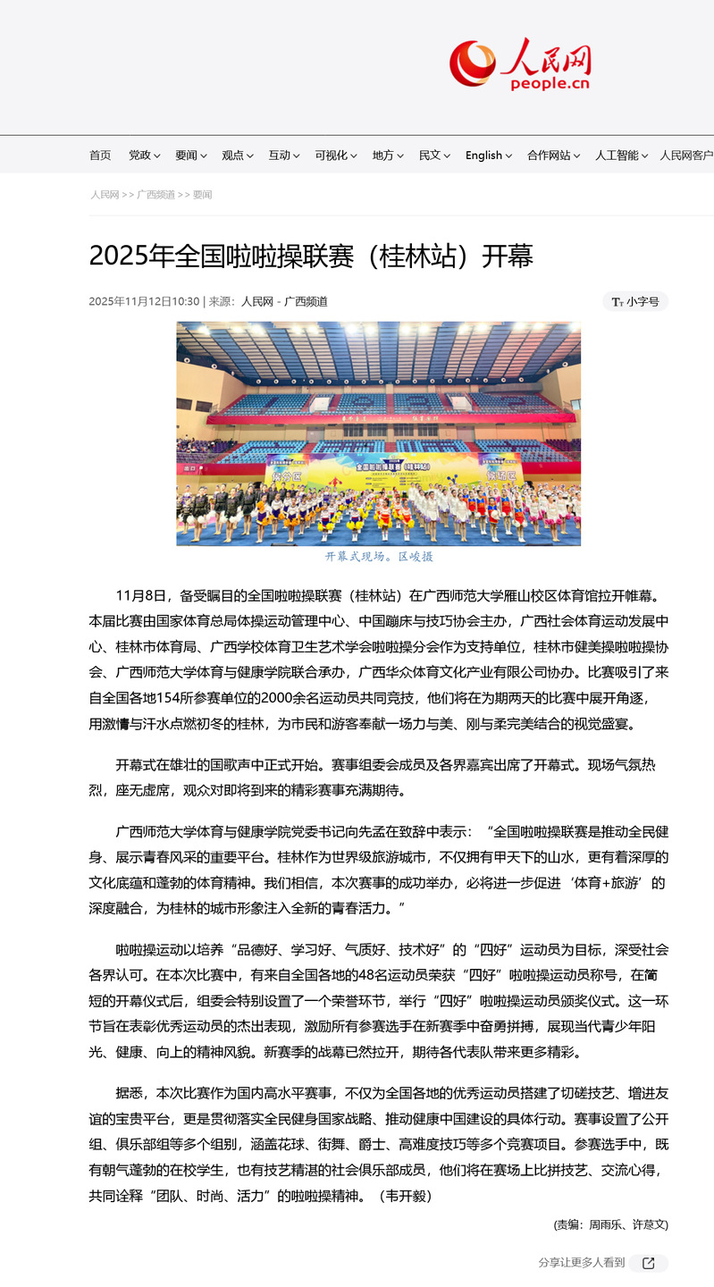 11月12日,【人民网】关注报道2025年全国啦啦操联赛(桂林站)赛事盛况。本届联赛于11月8日在我校雁山校区体育馆拉开帷幕,由国家体育总局体操运动管理中心、中国蹦床与技巧协会主办,我校体育与健康学院联合桂林市健美操啦啦操协会承办,为期两天的赛事为市民和游客呈现了一场力与美兼具的视觉盛宴。