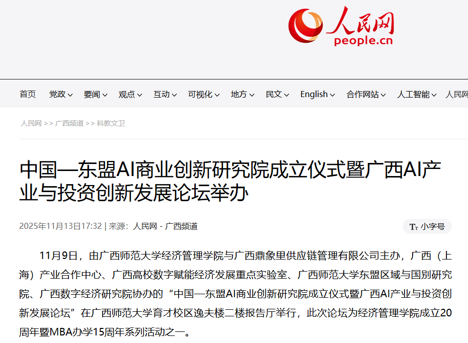 11月13日,【人民网】关注报道“中国—东盟AI商业创新研究院成立仪式暨广西AI产业与投资创新发展论坛”在我校育才校区成功举办。本次活动由我校经济管理学院与广西鼎象里供应链管理有限公司共同主办,是经济管理学院成立20周年暨MBA办学15周年系列活动之一。论坛期间,我校经济管理学院党委及行政负责人分别为研究院顾问委员会和客座教授颁发了聘书。在主旨演讲环节,来自香港理工大学、同济大学、复旦大学的专家学者围绕AI技术发展、数字金融科技及产学研融合等主题进行了深入分享。圆桌论坛上,与会代表就广西AI产业发展与投资创新展开深度交流,为地方AI生态建设建言献策。研究院的成立汇聚沪港桂三地资源,是广西深化中国—东盟数字经济合作的重要举措,未来将积极推动AI技术与区域产业融合,助力打造面向东盟的数字丝绸之路。