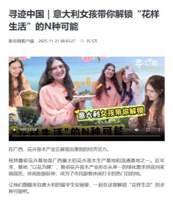 【新华网】报道我校意大利学生安丽雯受邀担任探访桂林叠彩花卉基地推介嘉宾 发表于 2025-11-21 近日,新华社记者走进桂林叠彩花卉基地,了解花卉苗木产业转型升级背后的故事。我校意大利学生安丽雯受邀担任旅游推介嘉宾。现将报道转载分享。报道链接:https://app.xinhuanet.com/news/article.html?articleId=a741381ed7871a7203a865365695392f×tamp=53415