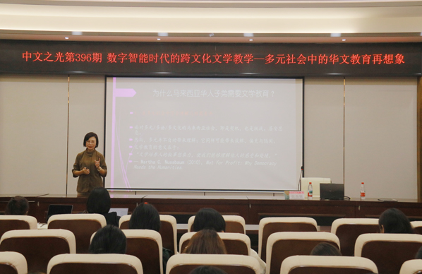 近日,广西师范大学文学院/新闻与传播学院、广西师范大学国家语言文字推广基地在雁山校区举行“数字智能时代的跨文化文学教学——多元社会中的华文教育再想象”(中文之光·研究生讲坛第396期)专题讲座。马来西亚新纪元大学学院文学院院长、博士生导师伍燕翎教授担任主讲嘉宾。