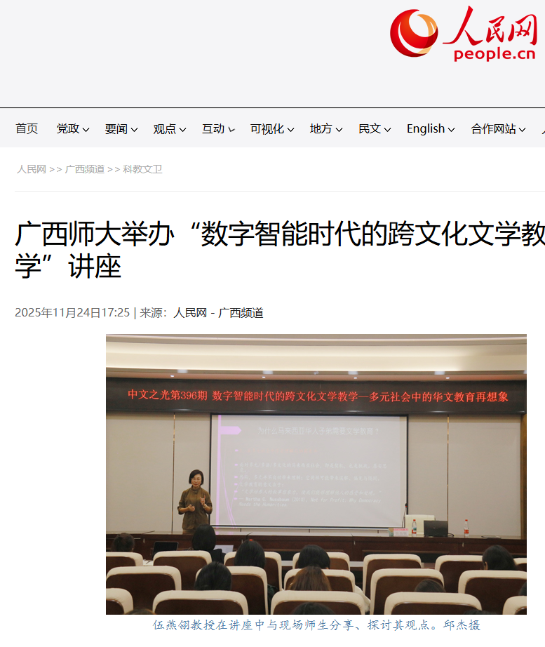 11月24日,【人民网】关注报道我校文学院/新闻与传播学院联合学校国家语言文字推广基地,在雁山校区成功举办“中文之光·研究生讲坛”第396期专题讲座。本次讲座特邀马来西亚新纪元大学学院文学院院长伍燕翎教授担任主讲,围绕“数字智能时代的跨文化文学教学”这一主题展开深入探讨。伍燕翎教授在讲座中指出,人工智能正推动华文教育迈向新的转型阶段。她主张将文学教育构建为语言、文化与经验的融合课堂,使其成为理解“他者文化”的重要窗口。本场讲座为我校师生带来了一场思想深刻、内容丰盛的学术盛宴,为数字时代的教育发展提供了富有启发的创新思路。