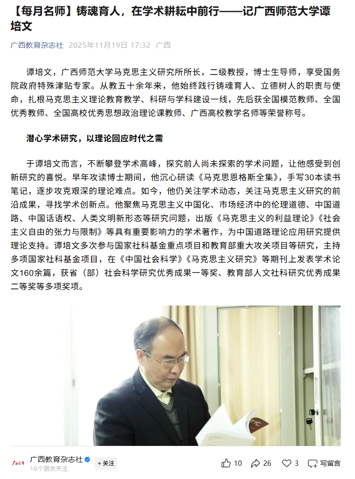 11月19日,【广西教育杂志社】关注报道谭培文教授躬耕教坛五十载,铸魂育人守初心。他是我校马克思主义学院的学科带头人,二级教授、博士生导师。从教五十余年来,他始终扎根教学科研一线,是享受国务院政府特殊津贴的专家,并荣获全国模范教师等多项荣誉。他潜心学术,在马克思主义研究领域成果丰硕,出版多部重要著作,发表论文160余篇,主持多项国家级项目。作为学科带头人,谭教授为我校的学科建设作出突出贡献:带领团队实现广西文科博士后流动站零的突破,推动马克思主义理论学科在第四轮评估中进入全国前20%,使该学科成为广西重点建设学科。在人才培养方面,他秉持“备课先备人”的理念,创新教学方法,累计培养2万余名学生,其中硕博研究生及博士后百余人,许多毕业生已成为服务广西及东盟地区发展的骨干力量。谭培文教授以坚定的理想信念和奉献精神,展现了我校教师的学者风骨与家国情怀,继续在教书育人与学术研究道路上砥砺前行。